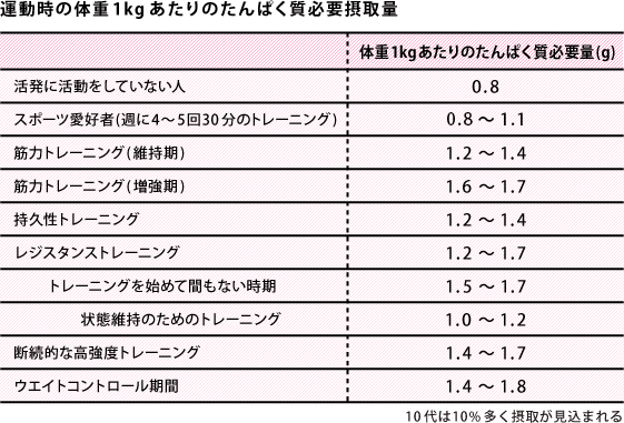 さらに、運動をどれだけしているかによってタンパク質摂取量を増やした方がよいそうです。
