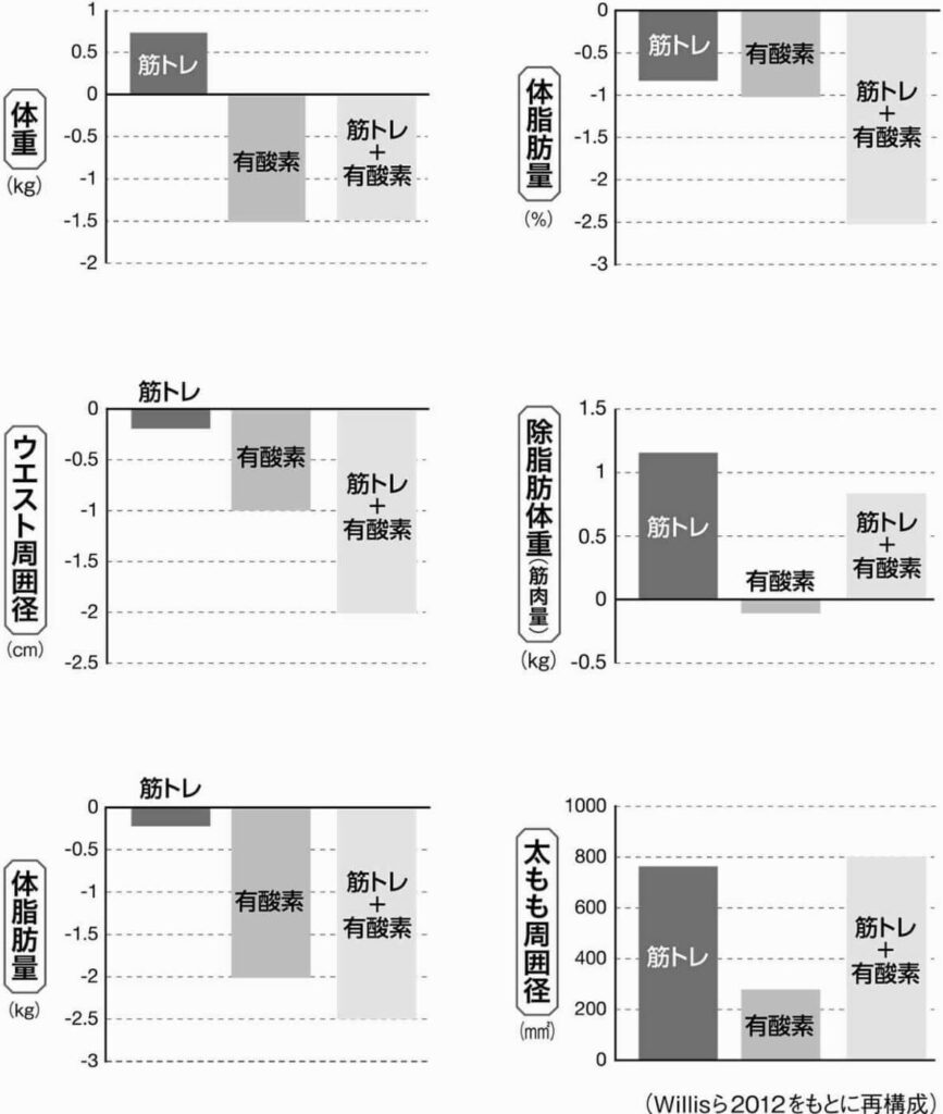 - 単純に体重減少を目的としているのであれば、有酸素運動及び有酸素運動&筋トレの組み合わせが効果的
