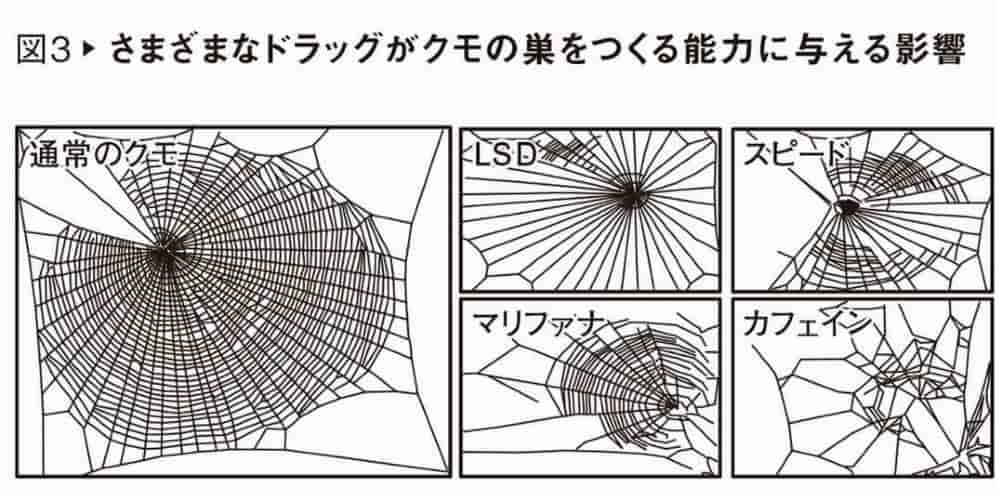 昆虫のクモにLSD、スピード、マリファナ、そしてカフェインを与え、どんな巣を作るかを観察したものです。